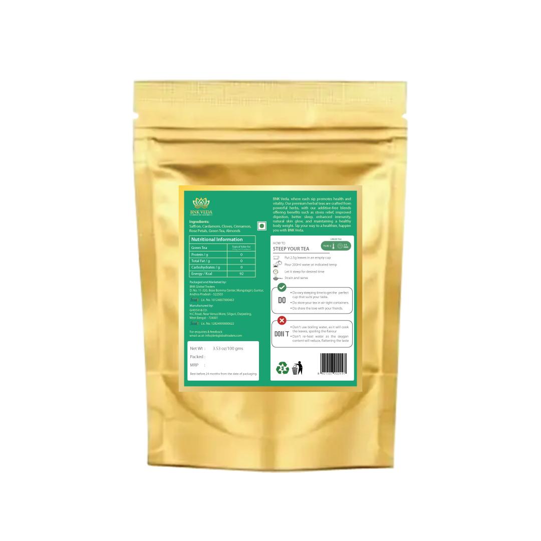 BNK VEDA Green Tea offers an authentic blend that perfectly balances rich Kashmiri flavors and timeless wellness. Crafted from premium loose green tea leaves and infused with saffron, cinnamon, almonds, cloves, rose petals, and cardamom, this herbal tea is renowned for its detoxifying and digestive benefits. Ideal for weight loss and boosting immunity, it is available as loose leaf or convenient tea bags. With variants like ginger-infused and ashwagandha-spiced blends, BNK VEDA Kahwa supports a healthy lifestyle through natural, Ayurvedic ingredients. Enjoy a soothing, aromatic cup that elevates your wellness journey.